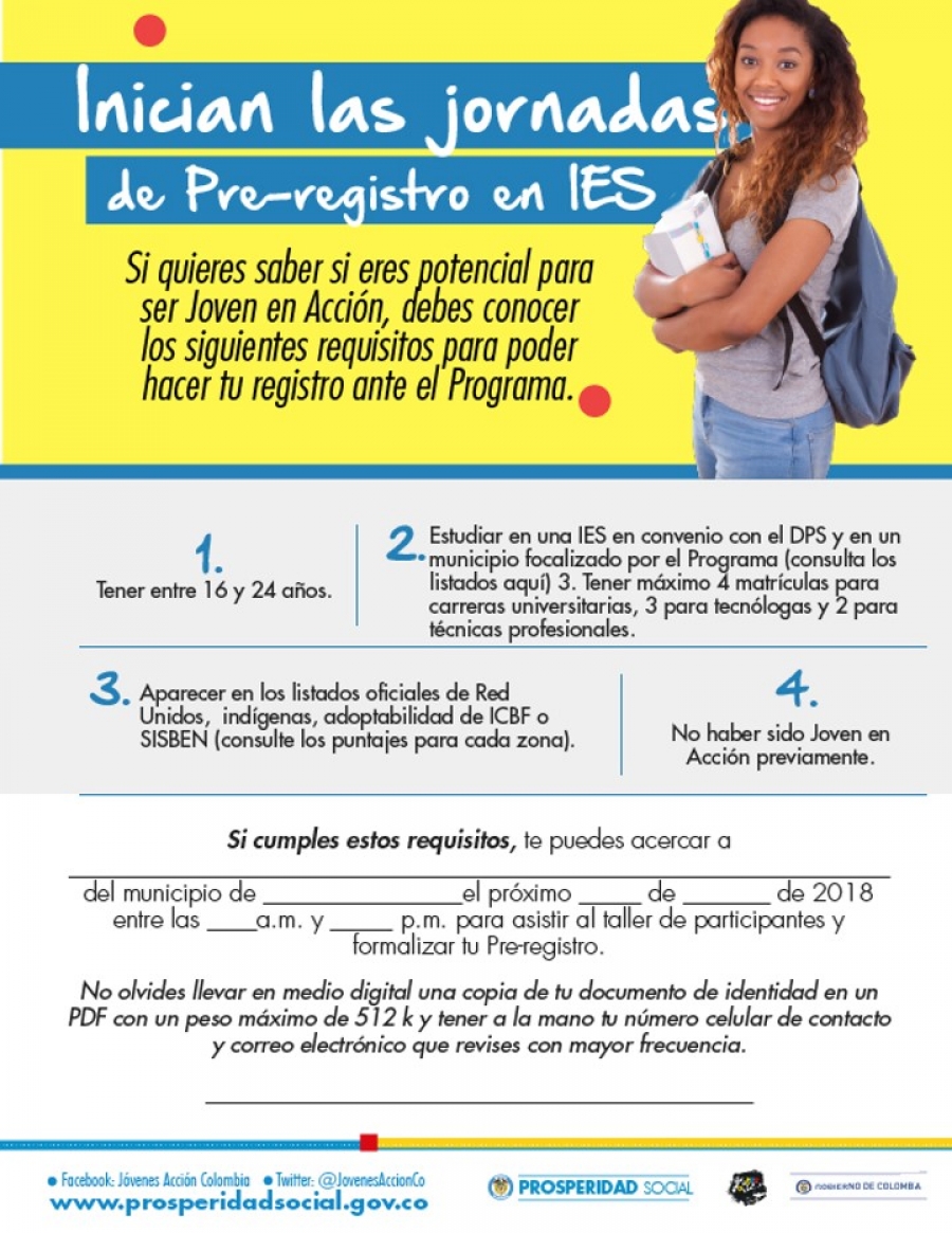 Jóvenes en Acción es un programa de Prosperidad Social que apoya a los jóvenes en condición de pobreza y vulnerabilidad, con la entrega de transferencias monetarias condicionadas –TMC-, para que puedan continuar sus estudios técnicos, tecnológicos y profesionales.