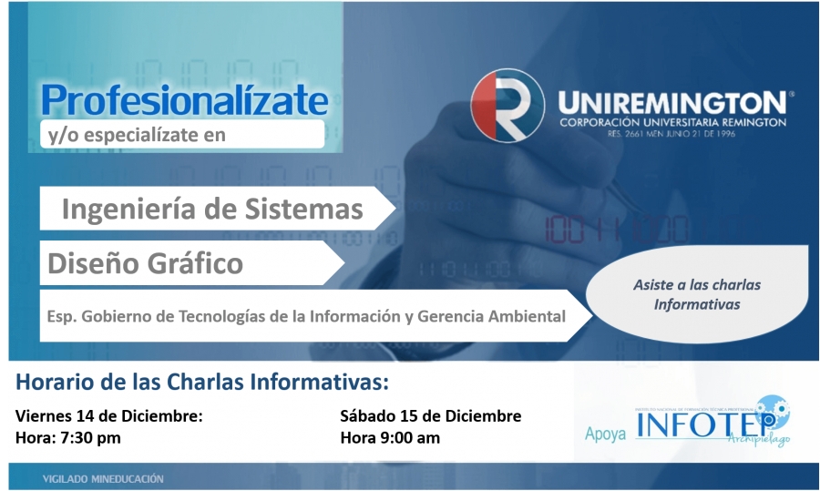 San Andrés Islas, 05 de diciembre de 2018. – El Instituto Nacional de Formación Técnica Profesional INFOTEP informa a toda la comunidad, especialmente a los jóvenes del Archipiélago, que dando continuidad a la oferta académica que hoy ofrece en asocio con la Corporación Universitaria Uní-Remington, los días 14 y 15 de diciembre estará llevando a cabo una charla informativa para ampliar información relacionada a esta oportunidad académica de nivel profesional.