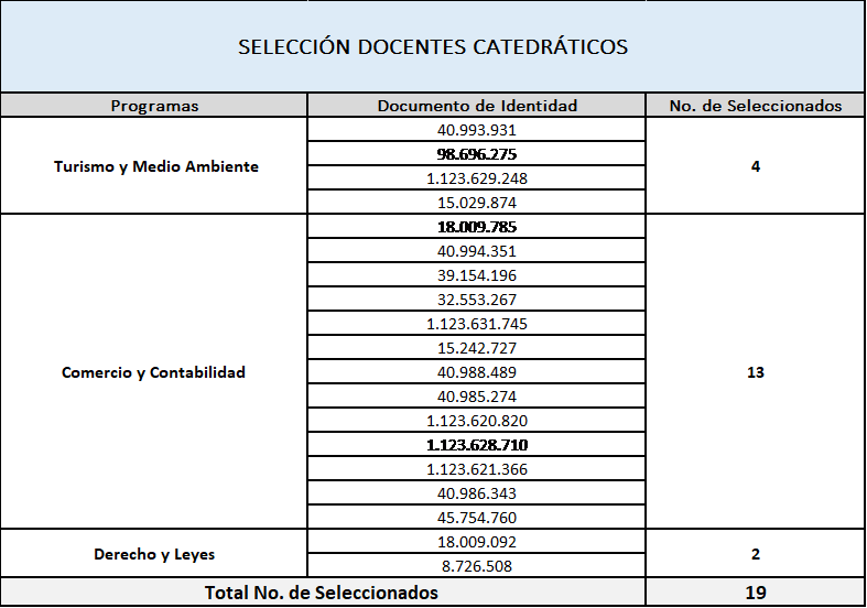 Para el resultado del presente proceso de selección evaluado por las directivas de la institución se tuvo en cuenta la evaluación de cada uno de los perfiles requeridos de acuerdo a las hojas de vida y a la experiencia docente presentada por los aspirantes, respondiendo así a los requisitos de la invitación que hizo pública INFOTEP a través de diferentes medios de comunicación.